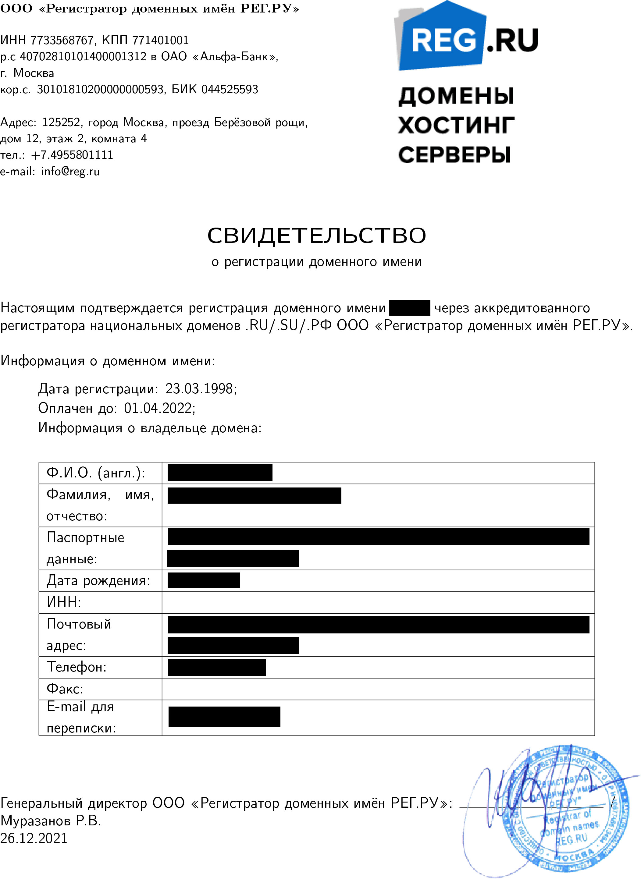 Свидетельство о регистрации доменного имени (можно получить у регистратора вашего домена), в котором указаны срок окончания регистрации и данные владельца домена.